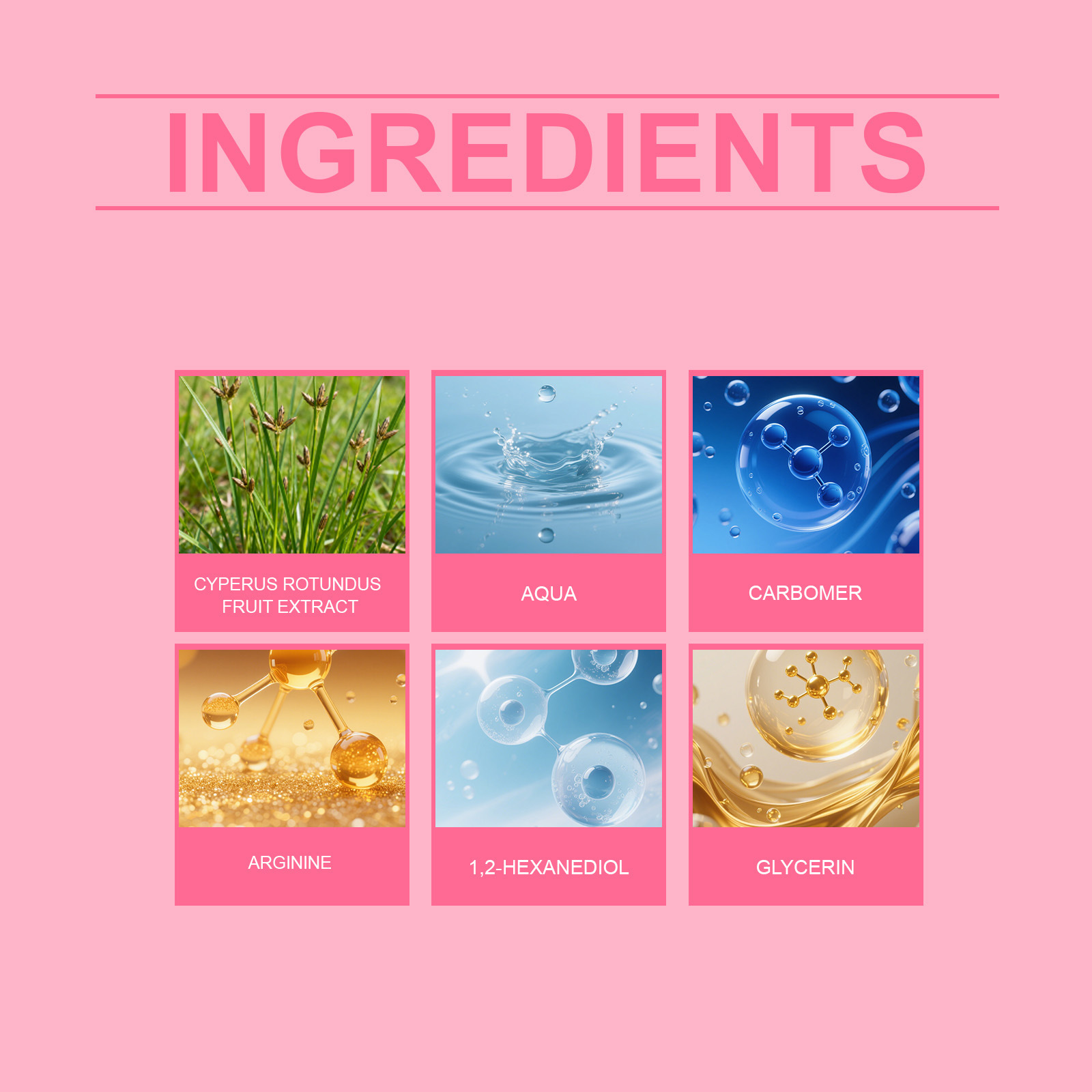 Ingredients: water, glycerin, 1,2- hexanediol, carbomer, arginine, Cyperus rotundus fruit extract.