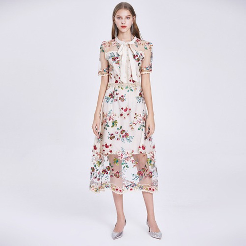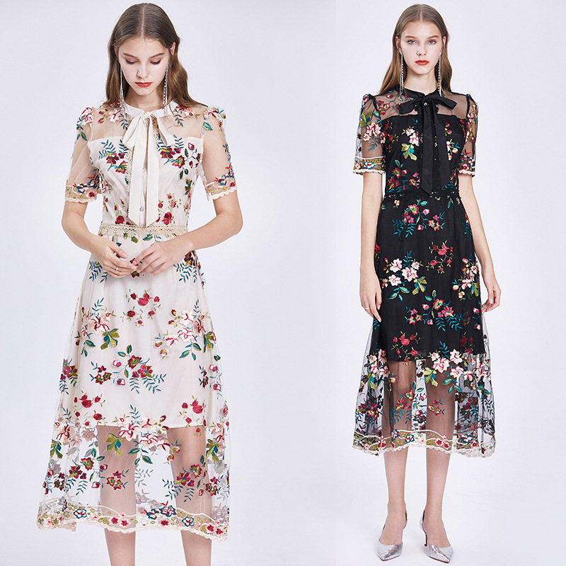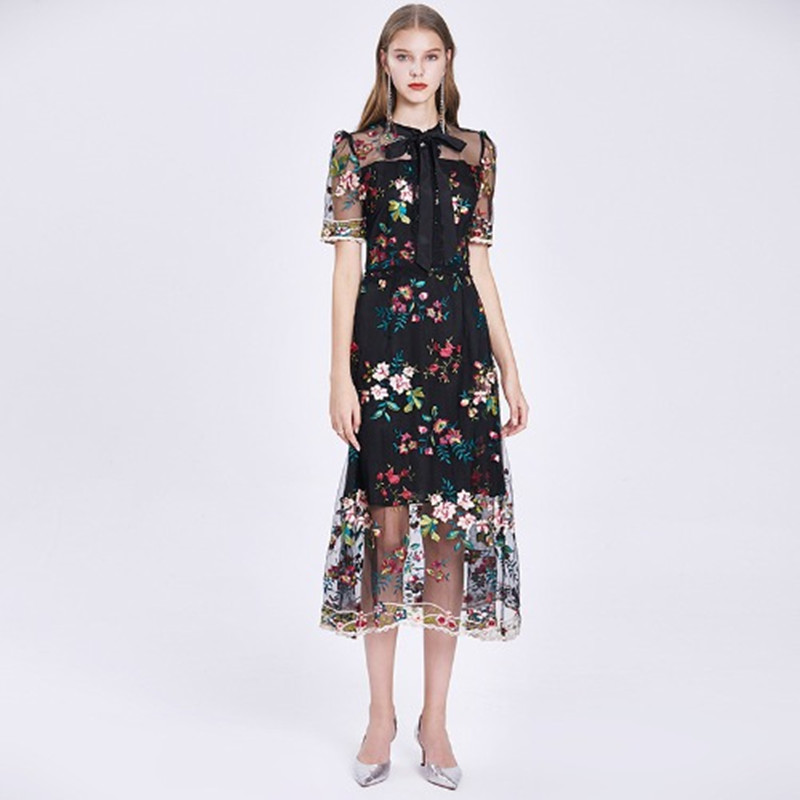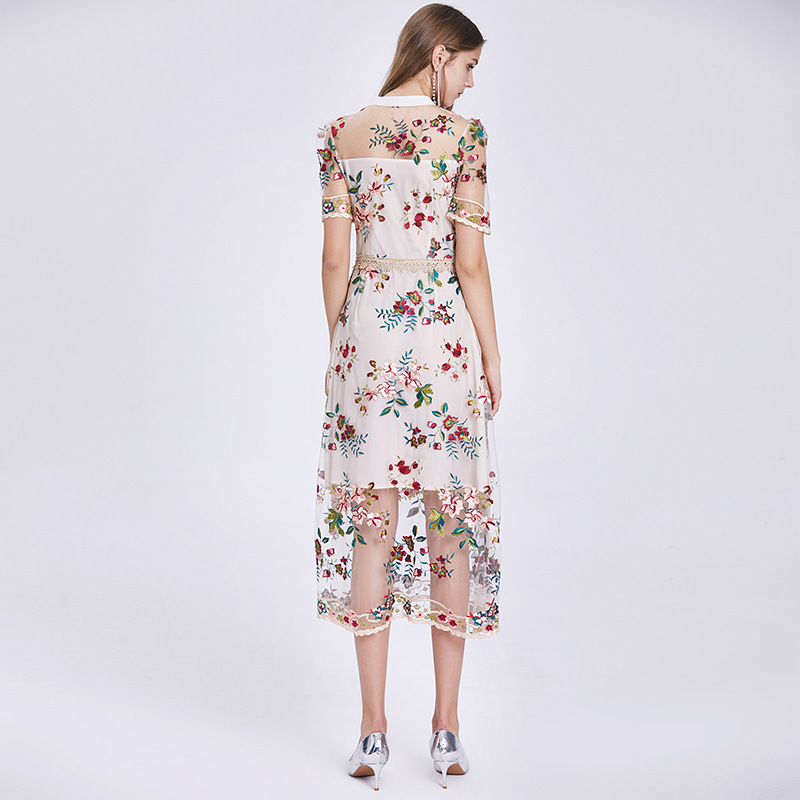Mesh Embroidered Flower Short-sleeved Dress